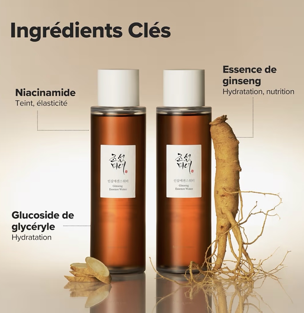 La Ginseng Essence Water Beauty of Joseon est une essence nourrissante enrichie d’ingrédients Hanbang (médecine traditionnelle coréenne à base de plantes) pour une peau plus lisse et revitalisée. Elle contient 80 % d’eau de racine de ginseng, et est composé d’eau de racine de ginseng, d’extrait de culture de cals de ginseng, d’extrait de racine de ginseng, d’extrait de baie de ginseng, et de filtrat de ferment Lactobacillus/racine de ginseng. Son ingrédient vedette, le ginseng, est efficace pour prévenir la pigmentation et les rides causées par les rayons UV. Il est connu pour favoriser l’hydratation (effet d’hydratation) de la peau. Il aide à protéger la peau des stimuli extérieurs en retenant l’hydratation en profondeur pendant longtemps.