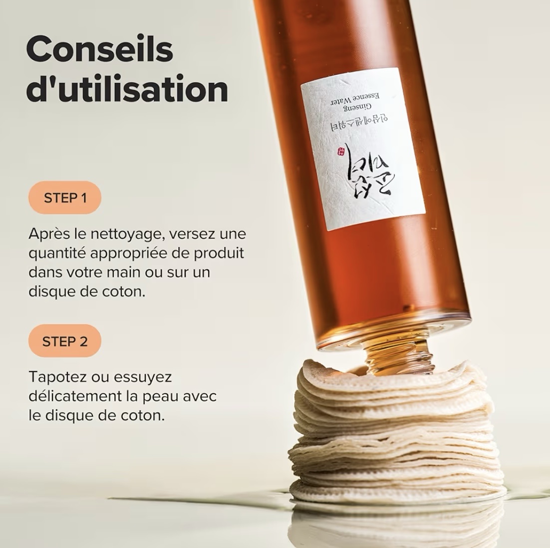 Après avoir nettoyé ton visage, prends une quantité appropriée de Ginseng Essence Water.
