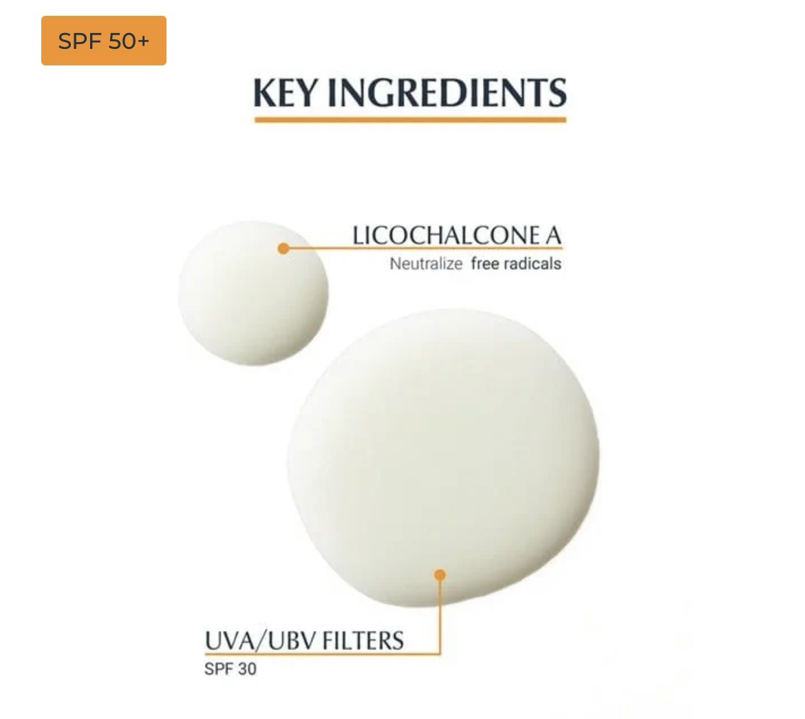 Sa formule contient une combinaison de filtres UVA/UVB pour une très haute protection contre les UV, et de la Licochalcone A qui agit sur les radicaux libres générés par les UV et la lumière visible de haute énergie.